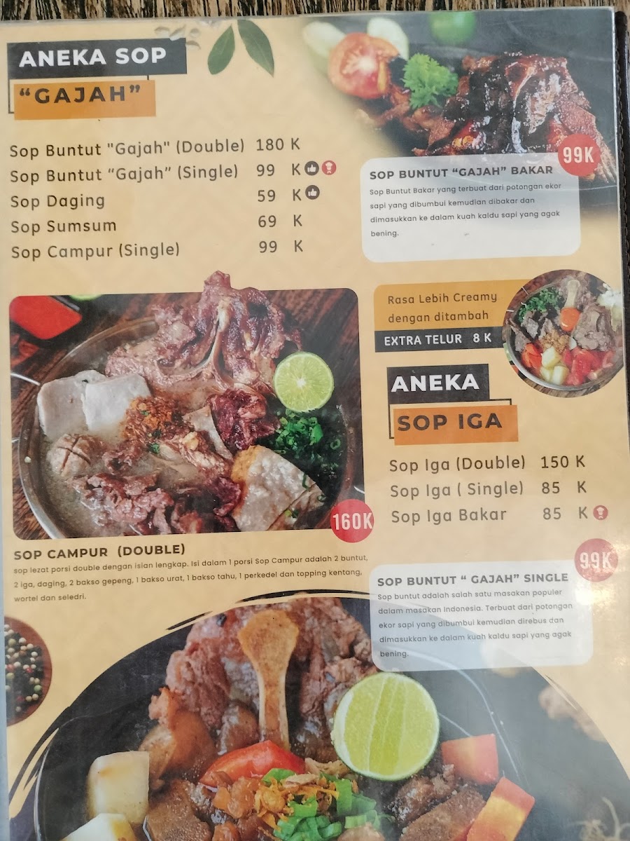 Welcome to Warung Buntut Gajah, a culinary gem located in the heart of Jakarta. Specializing in traditional Indonesian dishes, this eatery shines with its renowned oxtail soup, a unanimous favorite among guests. Patrons rave about the iga bakar and its tender meat, perfectly complemented by a rich, flavorful broth, simmered for 18 hours to attain a creamy, collagen-infused texture.